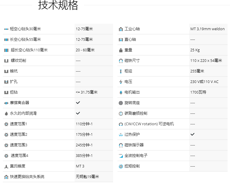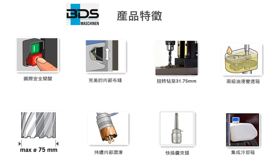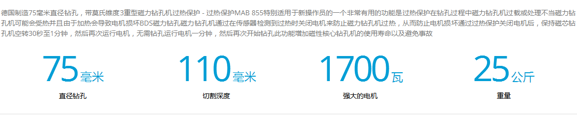 介紹:德國(guó)制造75毫米直徑鉆孔,帶莫氏錐度3重型磁力鉆孔機(jī)過(guò)熱保護(hù) - 過(guò)熱保護(hù)MAB 855特別適用于新操作員的一個(gè)非常有用的功能是過(guò)熱保護(hù)在鉆孔過(guò)程中磁力鉆孔機(jī)過(guò)載或處理不當(dāng)磁力鉆孔機(jī)可能會(huì)受熱并且由于加熱會(huì)導(dǎo)致電機(jī)損壞BDS磁力鉆孔磁力鉆孔機(jī)通過(guò)在傳感器檢測(cè)到過(guò)熱時(shí)關(guān)閉電機(jī)來(lái)防止磁力鉆孔機(jī)過(guò)熱,從而防止電機(jī)損壞通過(guò)過(guò)熱保護(hù)關(guān)閉電機(jī)后,保持磁芯鉆孔機(jī)空轉(zhuǎn)30秒至1分鐘,然后再次運(yùn)行電機(jī),無(wú)需鉆孔運(yùn)行電機(jī)一分鐘,然后再次開(kāi)始鉆孔此功能增加磁性核心鉆孔機(jī)的使用壽命以及避免事故