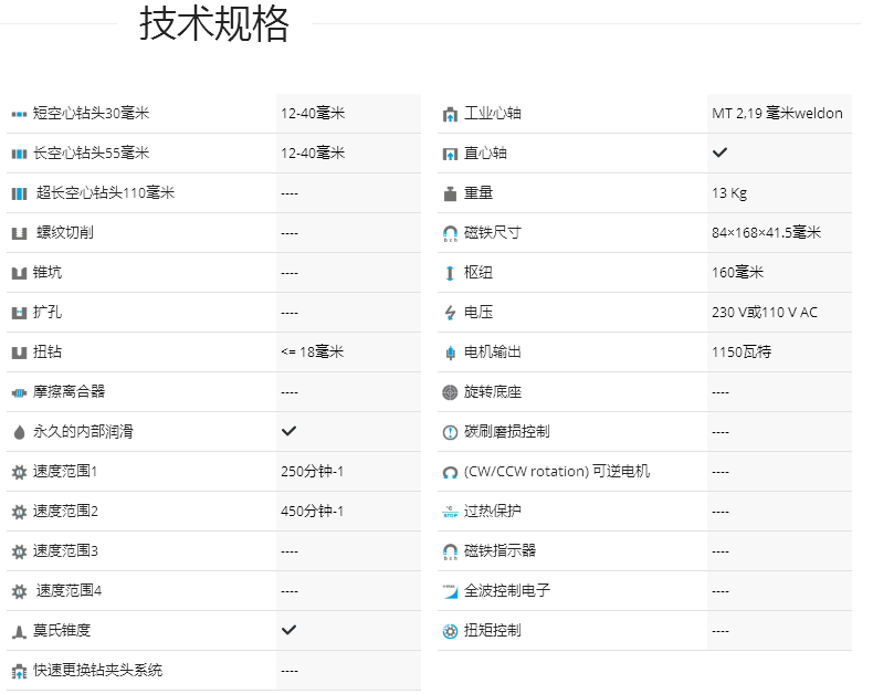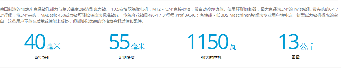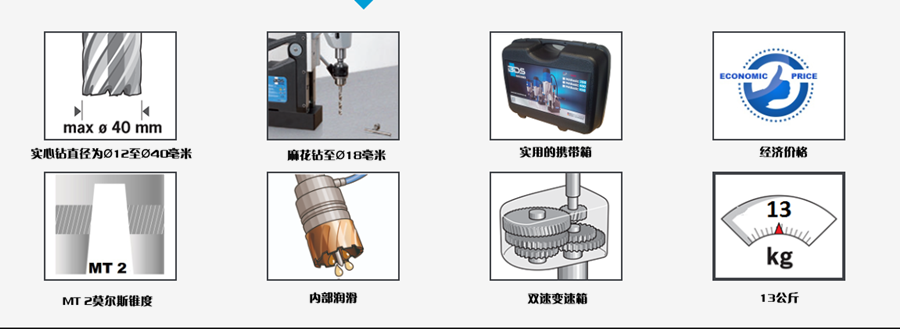 介紹:德國制造的40毫米直徑鉆孔能力與莫氏錐度2經(jīng)濟(jì)型磁力鉆。 10.5安培雙絕緣電機(jī),MT2 - “3/4”直接心軸,帶自動(dòng)冷卻功能。使用環(huán)形切割器,最大直徑為3/4“的Twist鉆孔;帶夾頭的6-1 / 3“行程,帶3/4”夾頭,MABasic 450磁力鉆可輕松轉(zhuǎn)換為標(biāo)準(zhǔn)鉆床,傳統(tǒng)麻花鉆具有6-1 / 3“行程.ProfiBASIC:高性能 - 低BDS Maschinen希望為專業(yè)用戶填補(bǔ)這一新型磁力鉆機(jī)概念的空白,這些用戶不能在質(zhì)量或性能上妥協(xié),但能夠以優(yōu)惠的價(jià)格放棄舒適性和配件。